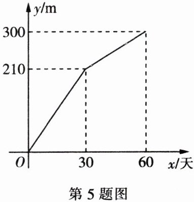 5. 甲、乙两个工程组同时挖掘某段隧道,两组每天挖掘长度均保持不变,合作一段时间后,乙组因维修设备而停工,甲组单独完成了剩下的任务,甲、乙两组挖掘的长度之和y(m)与甲组挖掘时间x(天)之间的关系如图所示。