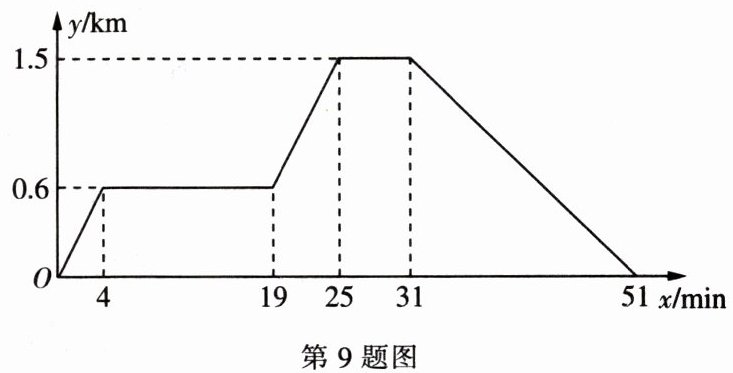 9. (2024·天津) 已知张华的家、画社、文化广场依次在同一条直线上,画社离家0.6km,文化广场离家1.5km。张华从家出发,先匀速骑行了4min到画社,在画社停留了15min,之后匀速骑行了6min到文化广场,在文化广场停留6min后,再匀速步行了20min返回家。如图中x表示时间,y表示离家的距离,图象反映了这个过程中张华离家的距离与时间之间的对应关系。