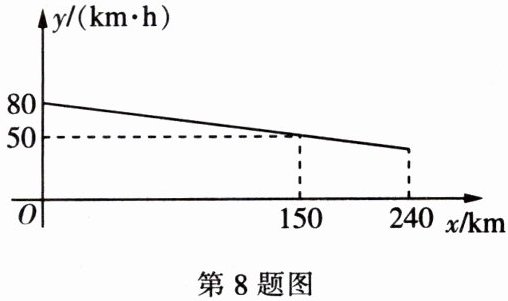 8. (2024·陕西) 我国新能源汽车快速健康发展,续航里程不断提升,王师傅驾驶一辆纯电动汽车从A市前往B市。他驾车从A市一高速公路入口驶入时,该车的剩余电量是 $ 80kW\cdot h $,行驶了240km后,从B市一高速公路出口驶出。已知该车在高速公路上行驶的过程中,剩余电量y(kW·h)与行驶路程x(km)之间的关系如图所示。