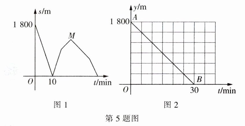 5. 小李从家里出发,沿笔直道路匀速步行去妈妈经营的商店帮忙,妈妈同时骑三轮车从商店出发,沿相同路线匀速回家装载货物,然后按原路原速返回商店,小李到达商店比妈妈返回商店早 $5$ $min$,在此过程中,设妈妈从商店出发开始所用时间为 $t$($min$),图 1 表示两人之间的距离 $s$($m$)与时间 $t$($min$)的函数关系的图象;图 2 中线段 $AB$ 表示小李和商店的距离 $y_1$($m$)与时间 $t$($min$)的函数关系的图象的一部分。请根据所给信息解答下列问题: