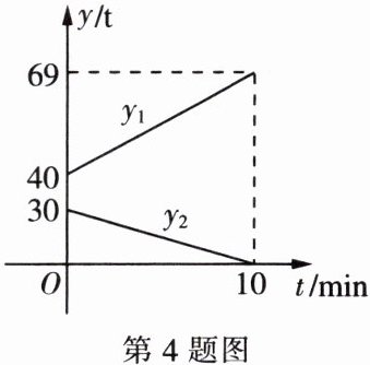 4. 空军某部的加油机接到命令,要求立即给另一架正在飞行的运输机进行空中加油。在加油过程中,设运输机的油箱余油量为 $y_1$ $t$,加油机的加油油箱余油量为 $y_2$ $t$,加油时间为 $t$ $min$,$y_1$,$y_2$ 与 $t$ 之间的函数图象如图所示,结合图象回答下列问题: