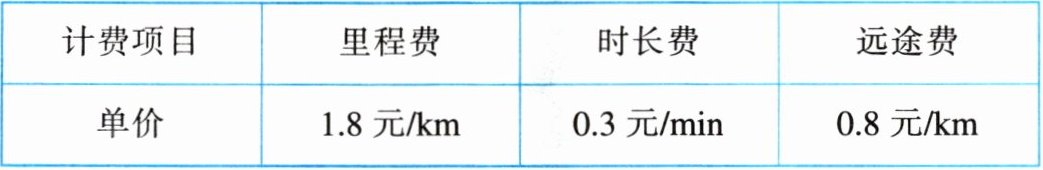 注:车费由里程费、时长费、远途费三部分构成,其中里程费按行车的实际里程计算;时长费按行车的实际时间计算;远途费的收取方式:行车里程 7 km 以内(含 7 km)不收远途费,超过 7 km 的,超出部分每千米收 0.8 元。