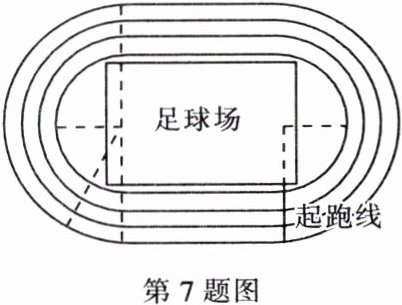 7. (2021·百色)据国际田联《田径场地设施标准手册》,400 m 标准跑道由两个平行的直道和两个半径相等的弯道组成,有 8 条跑道,每条跑道宽 1.2 m,直道长 87 m;跑道的弯道是半圆形,环形跑道第一圈(最内圈)弯道半径为 35.00 m 到 38.00 m 之间。
