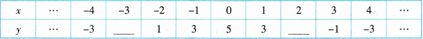 | $y$ | …$$ | $-3$ | ____ | $1$ | $3$ | $5$ | $3$ | ____ | $-1$ | $-3$ | …$$ |
