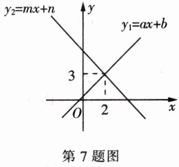 7. (2023·宁夏) 在同一平面直角坐标系中,一次函数$y_1 = ax + b$($a \neq 0$)与$y_2 = mx + n$($m \neq 0$)的图象如图所示,则下列结论错误的是( )