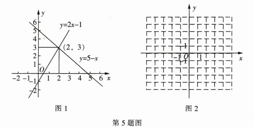 5. (1) 一次函数$y = 5 - x和y = 2x - 1$的图象如图1所示,则方程组$\begin{cases}x + y = 5, \\ 2x - y = 1\end{cases} $的解为____。