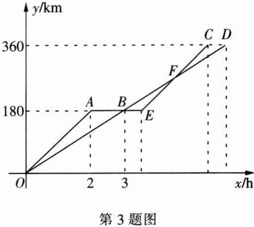 3. 快车从甲地驶向乙地,慢车从乙地驶向甲地,两车同时出发并且在同一条公路上匀速行驶,途中快车休息 $ 1.5 \, h $,慢车没有休息。设慢车行驶的时间为 $ x \, h $,快车行驶的路程为 $ y_1 \, km $,慢车行驶的路程为 $ y_2 \, km $。如图中折线 $ OAEC $ 表示 $ y_1 $ 与 $ x $ 之间的函数关系,线段 $ OD $ 表示 $ y_2 $ 与 $ x $ 之间的函数关系。