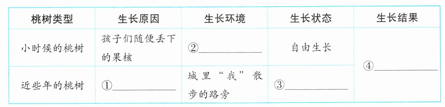 9. 文章刻画了两个时间段的桃树,请你结合全文补全下面的表格。