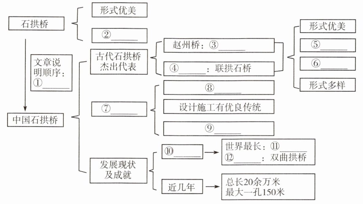 5. ①一般到具体 ②结构坚固 ③单拱石桥 ④卢沟桥 ⑤结构坚固 ⑥历史悠久 ⑦杰出原因 ⑧劳动人民的勤劳和智慧 ⑨石料丰富,便于就地取材 ⑩解放后 ⑪长虹大桥 ⑫世界仅有