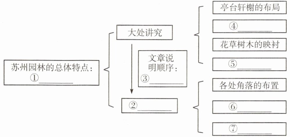 第一部分:总写苏州园林的特点是①处处完美如画;第二部分:从③由主到次的顺序介绍苏州园林的具体特点,包括④假山池沼的配合、⑤近景远景的层次;第三部分:介绍苏州园林的②细部注意,包括⑥园林门窗的雕镂、⑦整体色彩的搭配。