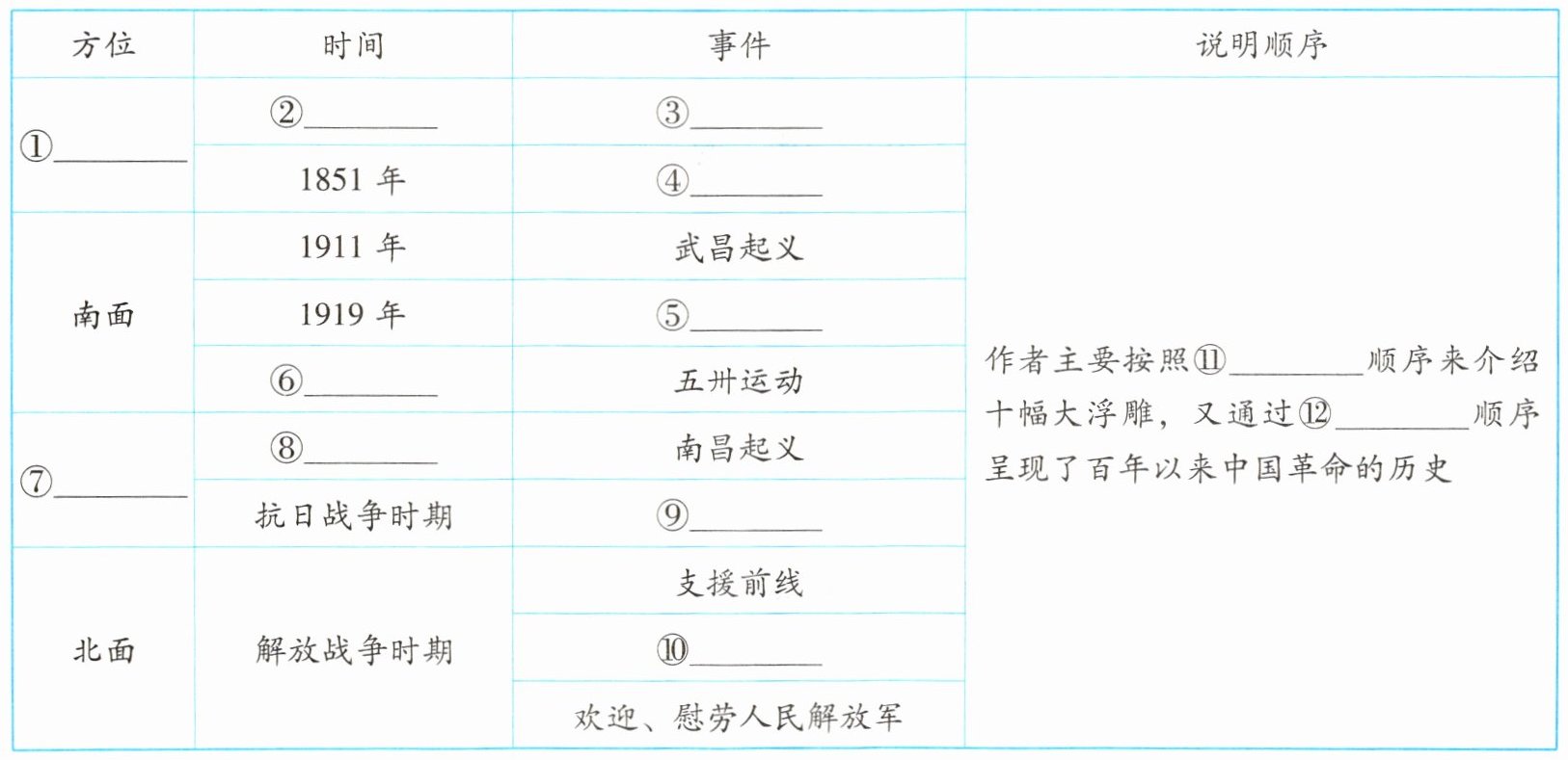 ①东面 ②1839 年 ③虎门销烟 ④金田起义 ⑤五四运动 ⑥1925 年 ⑦西面 ⑧1927 年 ⑨抗日敌后游击队 ⑩胜利渡长江,解放全中国 ⑪空间 ⑫时间