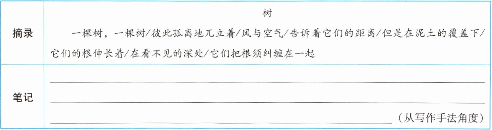 摘抄和笔记是重要的读书方法。下面是一位同学读《艾青诗选》后做的摘抄,请你为其补充心得笔记。