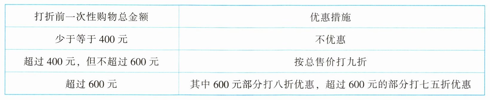 (3)若没有优惠促销,设小明在该商场购买同样商品要付a元,分两种情况讨论:①当打折前一次性购物总金额超过400元,但不超过600元时,可列方程0.9a=531,解得a=590.②当打折前一次性购物总金额超过600元,可列方程600×0.8+(a-600)×0.75=531,解得a=668.答:若没有优惠促销,小明在该商场购买同样商品要付590或668元.