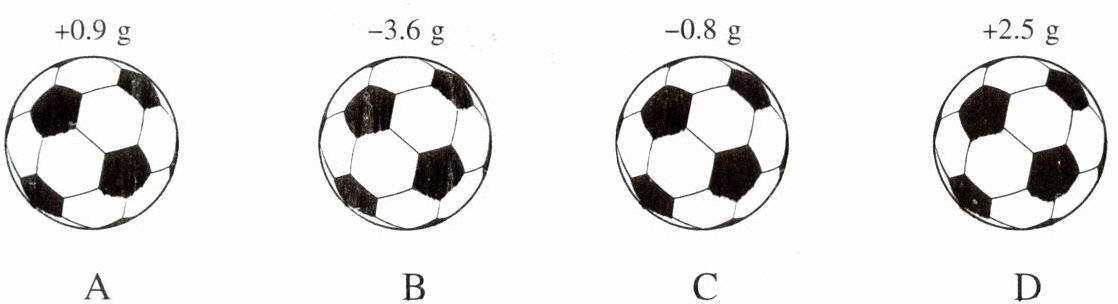 9. 如图,检测4个足球,其中超过标准质量的克数记作正数,不足标准质量的克数记作负数,从轻重的角度看,最接近标准的是(