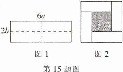 15. 已知一个长为 $6a$、宽为 $2b$ 的长方形如图1所示,沿图中虚线裁剪成四个相同的小长方形,按如图2的方式拼接,则阴影部分正方形的周长是