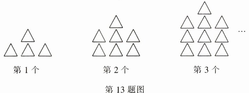 13. (2024·牡丹江)如图是由一些同样大小的三角形按照一定规律所组成的图形,第 $ 1 $ 个图有 $ 4 $ 个三角形,第 $ 2 $ 个图有 $ 7 $ 个三角形,第 $ 3 $ 个图有 $ 10 $ 个三角形…按照此规律排列下去,第 $ 674 $ 个图中三角形的个数是(