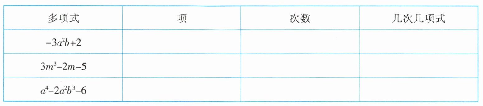 $-3a^{2}b$, 2;3;三次二项式 $3m^{3}$, -2m, -5;3;三次三项式 $a^{4}$, $-2a^{2}b^{3}$, -6;5;五次三项式