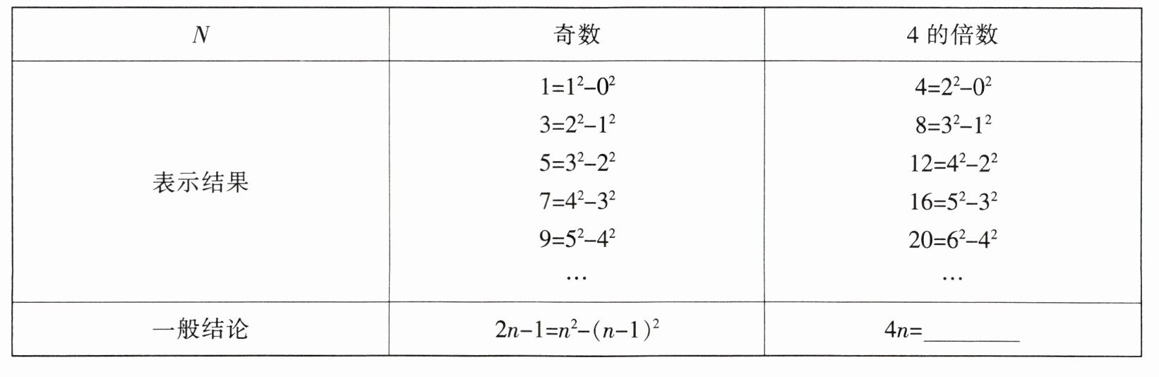 9. (2024·安徽) 数学兴趣小组开展探究活动,研究了“正整数 $N$ 能否表示为 $x^{2}-y^{2}$($x$,$y$ 均为自然数)”的问题.