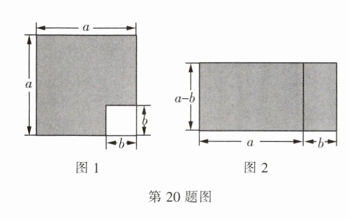 20. (8 分)如图 1 是一张边长为 $a$ 的正方形纸片,在它的一角剪去一个边长为 $b$ 的小正方形,然后将图 1 剩余部分(阴影部分)剪拼成如图 2 的一个大长方形(阴影部分).