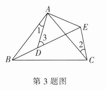 3. 如图,AB = AC,AD = AE,∠BAC = ∠DAE,∠1 = 22°,∠2 = 34°,则∠3 = ____。