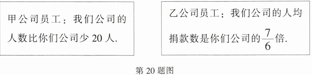 20. (8分)在甲、乙两公司全体员工捐款活动中,甲公司共捐款100000元,乙公司共捐款140000元.下面是甲、乙两公司员工的一段对话: