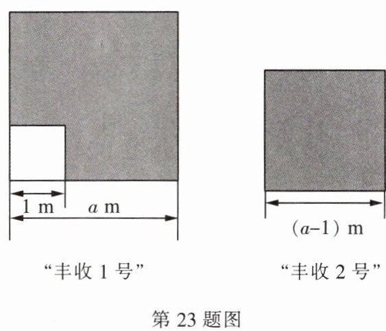 23. (12分)如图,“丰收1号”小麦试验田是边长为$am$($a>1$)的正方形去掉一个边长为1m的正方形蓄水池后余下的部分,“丰收2号”小麦试验田是边长为$(a - 1)m$的正方形,两块试验田的小麦都收获了500kg.