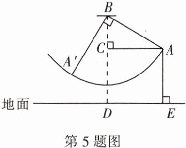 5. 如图是小朋友荡秋千的侧面示意图,静止时秋千位于铅垂线$BD$上,转轴$B到地面的距离BD = 2.5$m。小朋友在荡秋千过程中,当秋千摆动到最高点$A$时,测得点$A到BD的距离AC = 1.5$m,点$A到地面的距离AE = 1.5$m,当他从$A处摆动到A'$处时,若$A'B\perp AB$,求点$A'到BD$的距离。