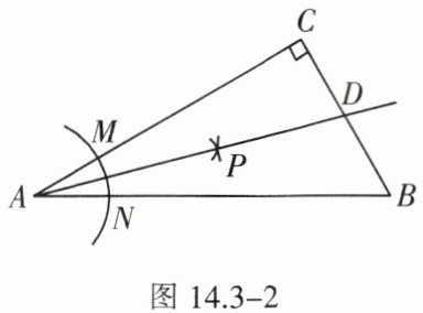 2. 如图 14.3 - 2,在 $\triangle ABC$ 中,$\angle C = 90^{\circ}$,以点 $A$ 为圆心,适当长为半径画弧,分别交 $AC$,$AB$ 于点 $M$,$N$,再分别以点 $M$,$N$ 为圆心,大于 $\frac{1}{2}MN$ 的长为半径画弧,两弧交于点 $P$,作射线 $AP$ 交 $BC$ 于点 $D$,$CD = 3$,$AB = 14$,则 $\triangle ABD$ 的面积是