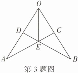 3. 如图,OE是$ ∠AOB $的平分线,$ BD ⊥ OA $于点D,$ AC ⊥ BO $于点C,则关于直线OE对称的三角形共有