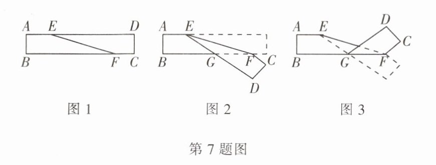 7. 折叠问题的实质是图形的轴对称变换,所以在解决折叠问题时可以充分运用轴对称的思想和轴对称的性质.如图1,$ ∠DEF = 25^{\circ} $,将长方形纸片ABCD沿直线EF折叠成图2,再沿直线GF折叠成图3,则图3中$ ∠CFE = $