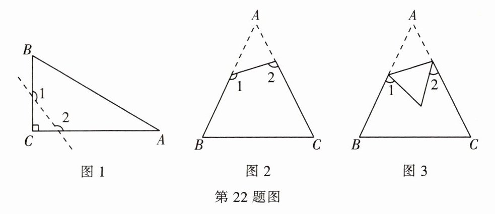 22. (12分)(1)如图1,已知 $ \triangle ABC $ 为直角三角形, $ \angle C = 90° $,若沿图中虚线剪去 $ \angle C $,则 $ \angle 1 + \angle 2 $ 等于
