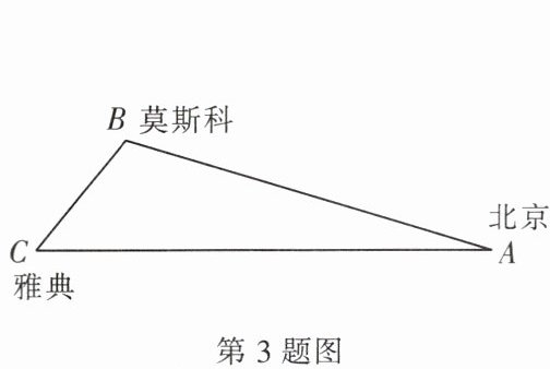 3. 北京、莫斯科、雅典三地之间想建立一个货物中转仓,使其到三地的距离相等,如图所示,则中转仓的位置应选在(