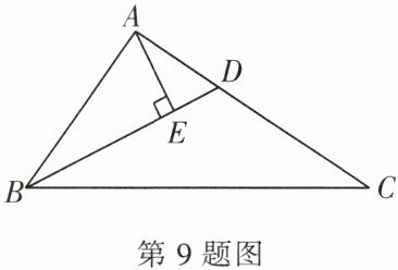 9. 如图,在$\triangle ABC$中,$D为边AC$上一点,且$BD平分\angle ABC$,过点$A作AE\perp BD于点E$。若$\angle ABC = 64^{\circ}$,$\angle C = 29^{\circ}$,$AB = 4$,$BC = 10$,求$AE$的长。