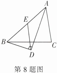 8. 如图,在$\triangle ABC$中,$AD平分\angle BAC$,$AD\perp BD于点D$,$DE// AC交AB于点E$,若$AB = 8$,则$DE = $
