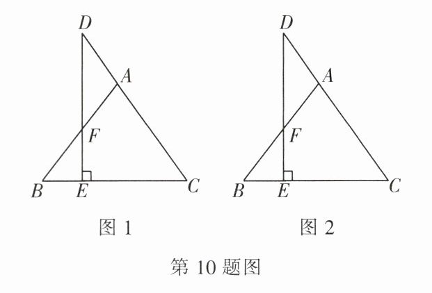 10. 如图,在$\triangle ABC$中,$AB = AC$,$D为CA$延长线上一点,且$DE\perp BC交AB于点F$。
