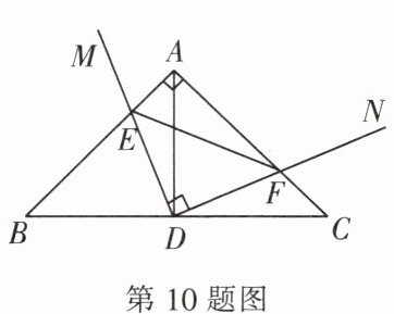 10. 如图,在$Rt\triangle ABC$中,$\angle B = 45^{\circ}$,$AB = AC$,$D为BC$的中点,直角$\angle MDN绕点D$旋转,$DM$,$DN分别与边AB$,$AC交于E$,$F$两点,下列结论:①$\triangle DEF$是等腰直角三角形;②$AE = CF$;③$\triangle BDE \cong \triangle ADF$;④$BE + CF = EF$.其中正确的个数是(
