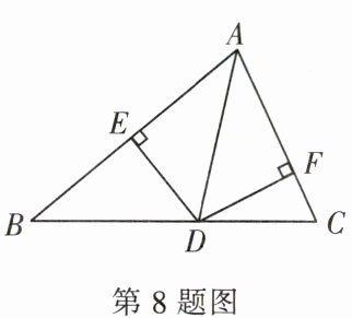 8. 如图,$AD是\triangle ABC中\angle BAC$的平分线,$DE \perp AB$,交$AB于点E$,$DF \perp AC$,交$AC于点F$,若$S_{\triangle ABC} = 7$,$DE = 2$,$AB = 4$,则$AC$的长是(