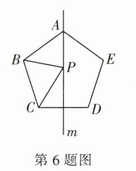 - 6. 如图,直线 $m$ 是正五边形 $ABCDE$ 的对称轴,点 $P$ 是直线 $m$ 上的动点,当 $BP + CP$ 的值最小时,$\angle BPC$ 的度数是______.