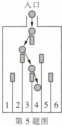 5. 学完概率知识后,小明尝试用纸板设计了一款游戏,小球从入口处掉落后每碰到卡口,可能向左弹跳,也可能向右弹跳,且两种可能性均相同,小球经过 3 次弹跳后最终落入标号为 1~6 的 6 个卡槽. 图为小球某次掉落情况:小球第 1 次向左弹跳,第 2 次向右弹跳,第 3 次向右弹跳,即“左→右→右”,最后落入卡槽 4,请用树状图法求出小球掉落到 5 号卡槽的概率.