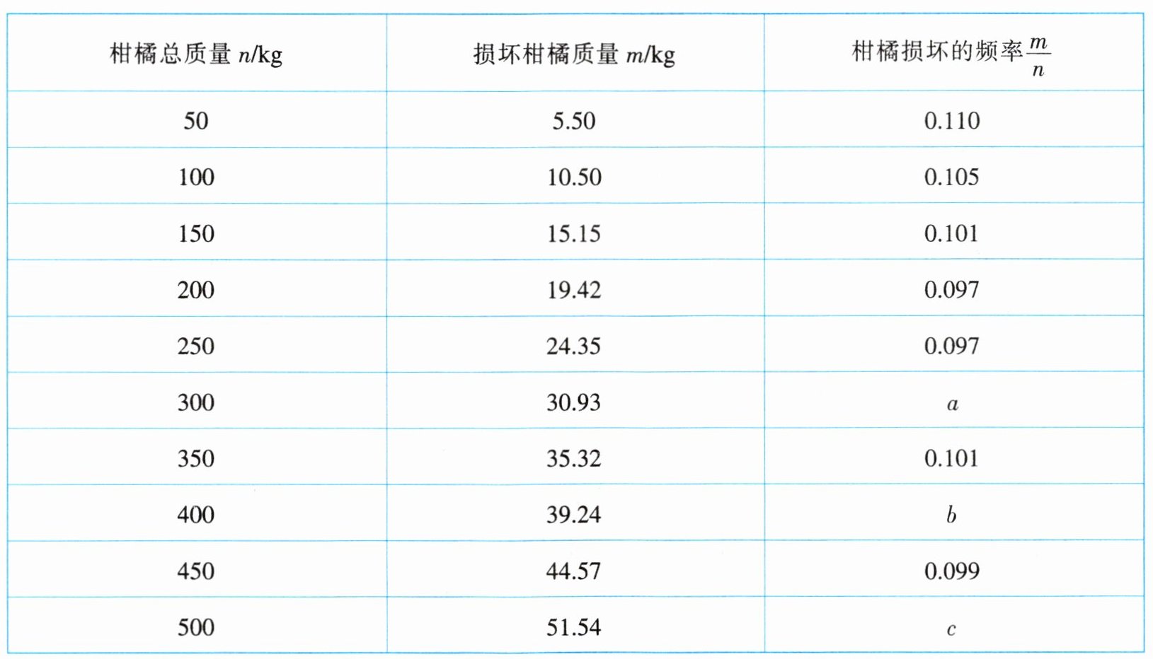 6. 某水果公司新进了 10 000 kg 柑橘,销售人员首先从所有的柑橘中随机地抽取若干柑橘,进行了“柑橘损坏率”统计,并把获得的数据记录在下表中: