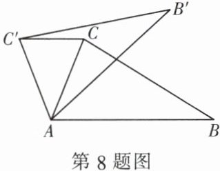 8. 如图, 在△ABC中, ∠CAB= 75°, 在同一平面内, 将△ABC绕点A旋转到△AB'C'的位置, 使得CC'//AB, 则∠CAC'的度数是 (