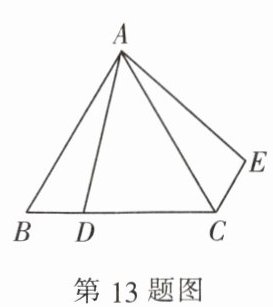 13. 如图, 在△ABC中, AB= AC, ∠BAC= 56°, 点D在边BC上, ∠BAD= 18°, 将AD绕点A逆时针旋转56°得到AE, 连接CE, 则∠AEC的度数为