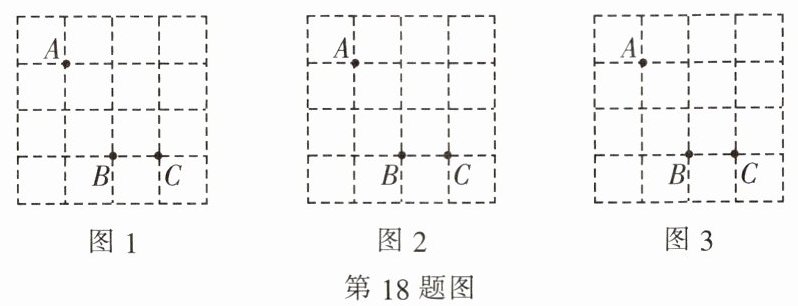 18. (9分)如图, 方格纸中有三个点A, B, C, 要求作一个四边形使这三个点在这个四边形的边 (包括顶点) 上, 且四边形的顶点在方格的顶点上.