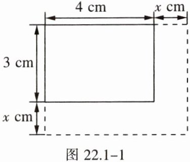 【例】如图所示,一个矩形的长为 $ 4\mathrm{cm} $,宽为 $ 3\mathrm{cm} $,如果将这个矩形的长与宽都增加 $ x\mathrm{cm} $,那么这个矩形的面积增加 $ y\mathrm{cm}^{2} $。