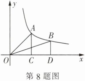 8. 如图, 过双曲线 $ y = \frac{k}{x} $ ($ k $ 是常数, $ k > 0 $, $ x > 0 $) 的图象上两点 $ A $, $ B $ 分别作 $ AC \perp x $ 轴于点 $ C $, $ BD \perp x $ 轴于点 $ D $, 则 $ \triangle AOC $ 的面积 $ S_1 $ 和 $ \triangle BOD $ 的面积 $ S_2 $ 的大小关系为 (