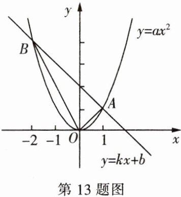 13. 如图,已知一次函数 $ y = kx + b $ 的图象与二次函数 $ y = ax^2 $ 的图象交于点 $ A(1, m) $ 和 $ B(-2, 4) $。