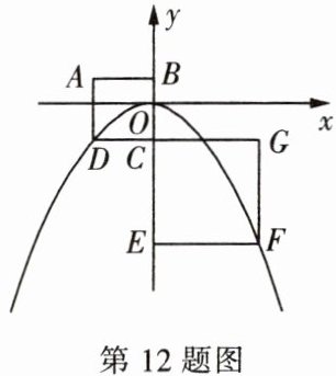 12. 如图,正方形 $ ABCD $,$ CEFG $ 的顶点 $ D $,$ F $ 都在抛物线 $ y = -\frac{1}{2}x^2 $ 上,点 $ B $,$ C $,$ E $ 均在 $ y $ 轴上。若点 $ O $ 是 $ BC $ 边的中点,则正方形 $ CEFG $ 的边长为