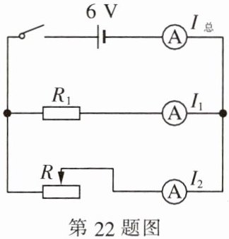 22. (12 分) 在并联电路中, 电源电压为 $ U_{总} = 6 \, V $, 小李根据 “并联电路分流不分压” 的原理知道: $ I_{总} = I_1 + I_2 \left( I_1 = \frac{6}{R_1}, I_2 = \frac{6}{R} \right) $, 已知 $ R_1 $ 为定值电阻, 当 $ R $ 变化时, 干路电流 $ I_{总} $ 也会发生变化, 且干路电流 $ I_{总} $ 与 $ R $ 之间满足如下关系: $ I_{总} = 1 + \frac{6}{R} $.