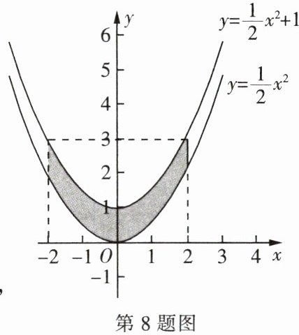 8. 如图为函数 $ y = \frac{1}{2}x^2 + 1 $ 和 $ y = \frac{1}{2}x^2 $ 的图象,则图中阴影部分的面积为