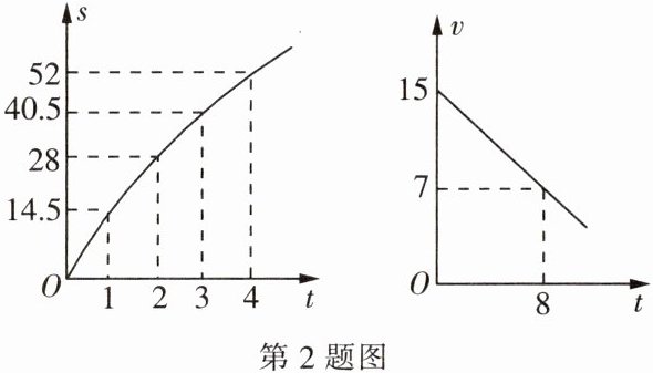 2. 公路上正在行驶的甲车,发现前方 $ 30 \, m $ 处沿同一方向行驶的乙车后,为了行驶安全,开始减速,减速后甲车行驶的路程 $ s $(单位:$ m $)、速度 $ v $(单位:$ m/s $)与时间 $ t $(单位:$ s $)的关系可以分别用二次函数和一次函数表示,其图象如图所示.